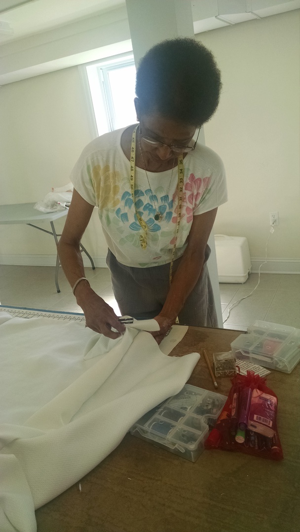 Sis. Joy Goddard is hard at work measuring, cutting and pinning fabric before sitting down at the sewing machine to make chair covers for the pulpit for Holy Communion services. She is an extremely talented seamstress and has also sewn curtains, chair cushions, costumes and other items for the church. Sis. Joy even plans to teach a basic sewing skills class to interested FBC members in the fall.