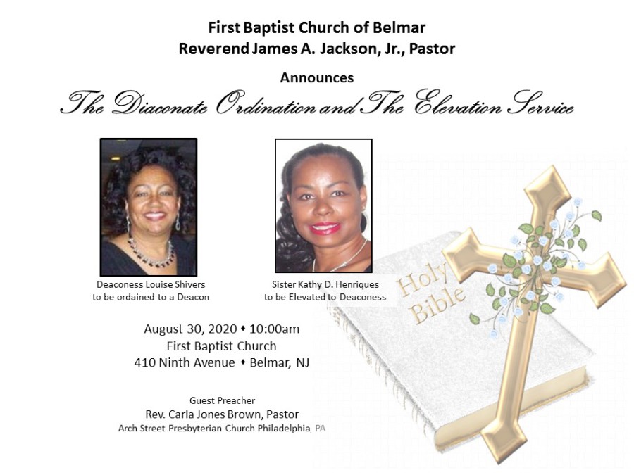 On Sunday morning, August 30, 2020, First Baptist Church, lead by our pastor, Rev. James A. Jackson Jr., ordained Deaconess Louise Shivers to the position of Deacon, and elevated Sis. Kathy D. Henriques to the position of Deaconess. The service was historic in the fact that Deacon Louise was the first female to be ordained a deacon in the 120 years of the church’s existence.